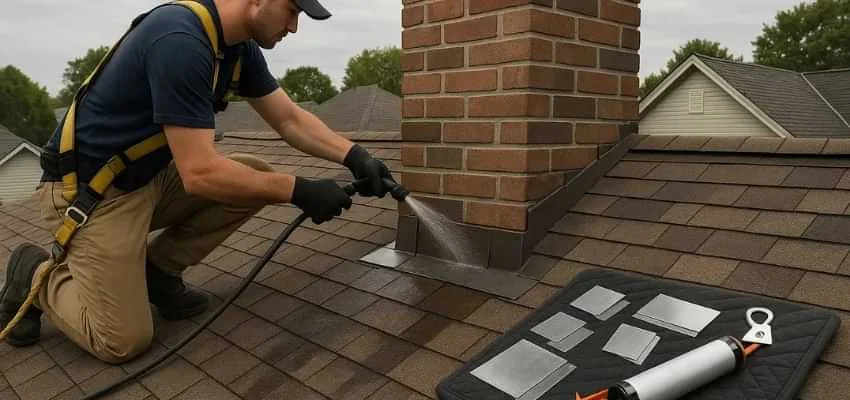 We examine crown slope, cap fit, mortar joints, brick or stone surfaces, and flashing transitions at the roofline. In Baldwin, Keswick this area is often the origin of leaks.